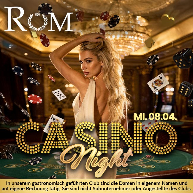 Der  Club Rom bietet nur gastronomische Leistungen an, der Zutritt ist nur volljährigen Gästen gestattet. Wir weisen darauf hin, dass die anwesenden weiblichen Gäste  in eigenem Namen und auf eigene Rechnung selbständig tätige Dienstleister (m/w/d) sind. Sie sind nicht Subunternehmer oder Angestellte des Club Rom . Sämtliche angebotenen und kostenpflichtigen Dienstleistungen werden als Geschäftsbeziehung ausschließlich zwischen den weiblichen Gäste und den männlichen Gästen eingegangen. Der Club Rom hat keinen Einfluss auf die Ausgestaltung und die Abwicklung.